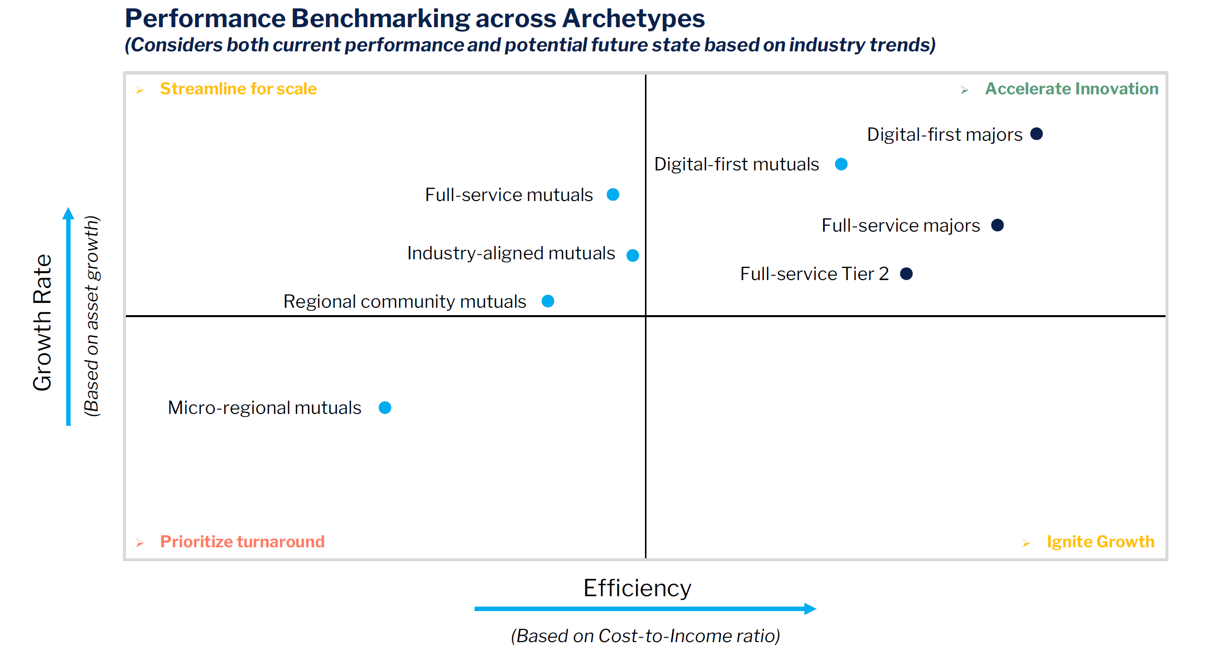 Benchmarking performance across the different archetypes reveals that Mutual Banks generally underperform larger players on both growth and efficiency, facing higher cost-to-income ratios and modest revenue growth when compared to larger banks.